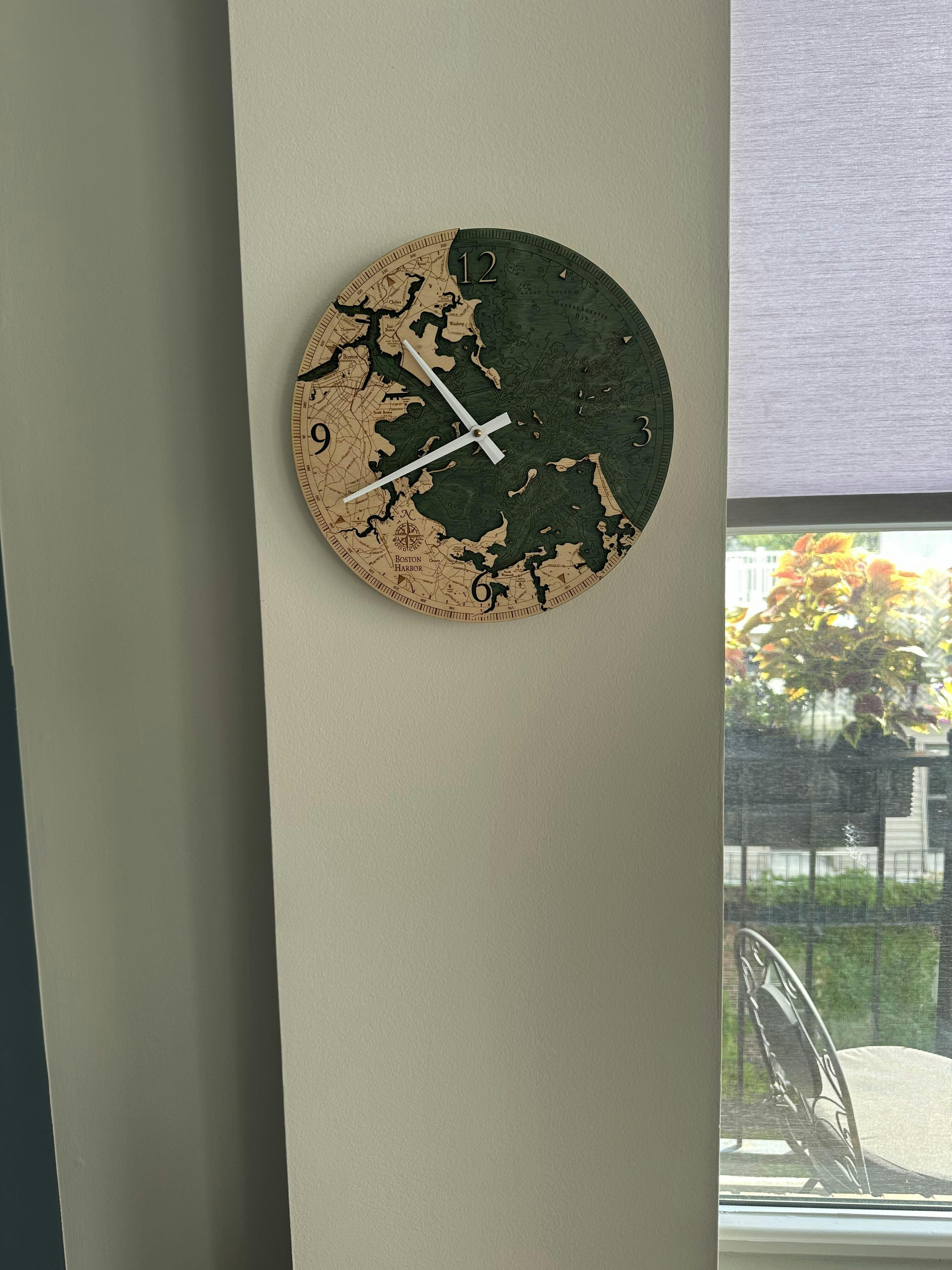 Our nautical wooden clock showcases the incredible shorelines of Boston Harbor as well as the surrounding islands. The clock is twelve inches in diameter and features a single-layer depth map with a hand-stained blue/green base that highlights the color of the natural wood. The wood art topography is depicted with engraved water-depth contours and finished with additional etchings of significant landmarks, attractions, and points of interest on the clock face.
