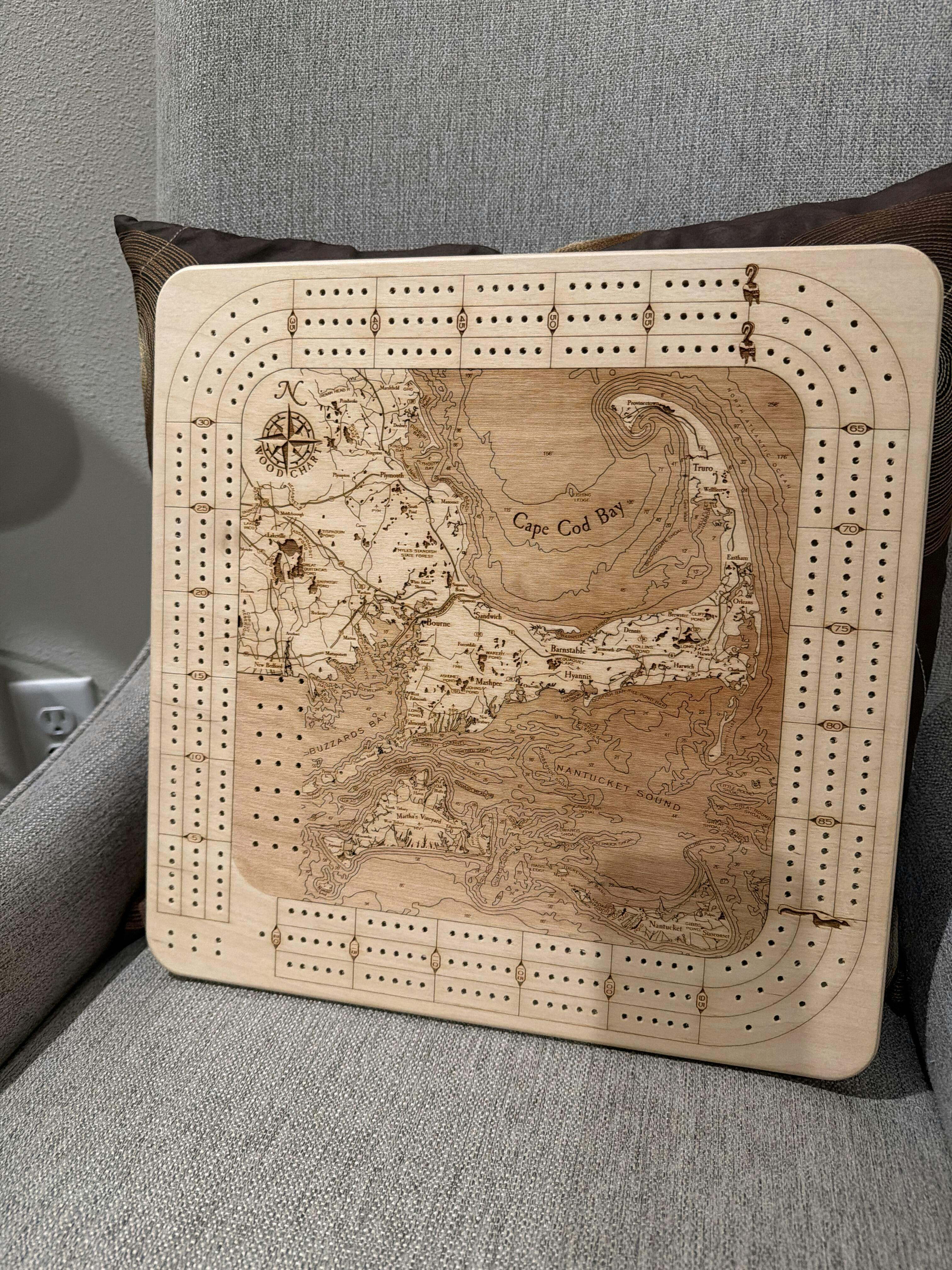 Our Cape Cod Cribbage Board adds a nautical aspect to a beloved card game. A laser-etched wood map decorates the front of the cribbage board that comes with skunks, pegs, and a hidden storage compartment in the back. Each wood cribbage board is laser engraved with the Cape Cod shoreline, etched with points of interest, and then rubbed with an oil-based finish to preserve the one-of-a-kind grain of the natural wood. Store this topographic cribbage board on your table or hang it on the wall with the nail slot in the back of the board.