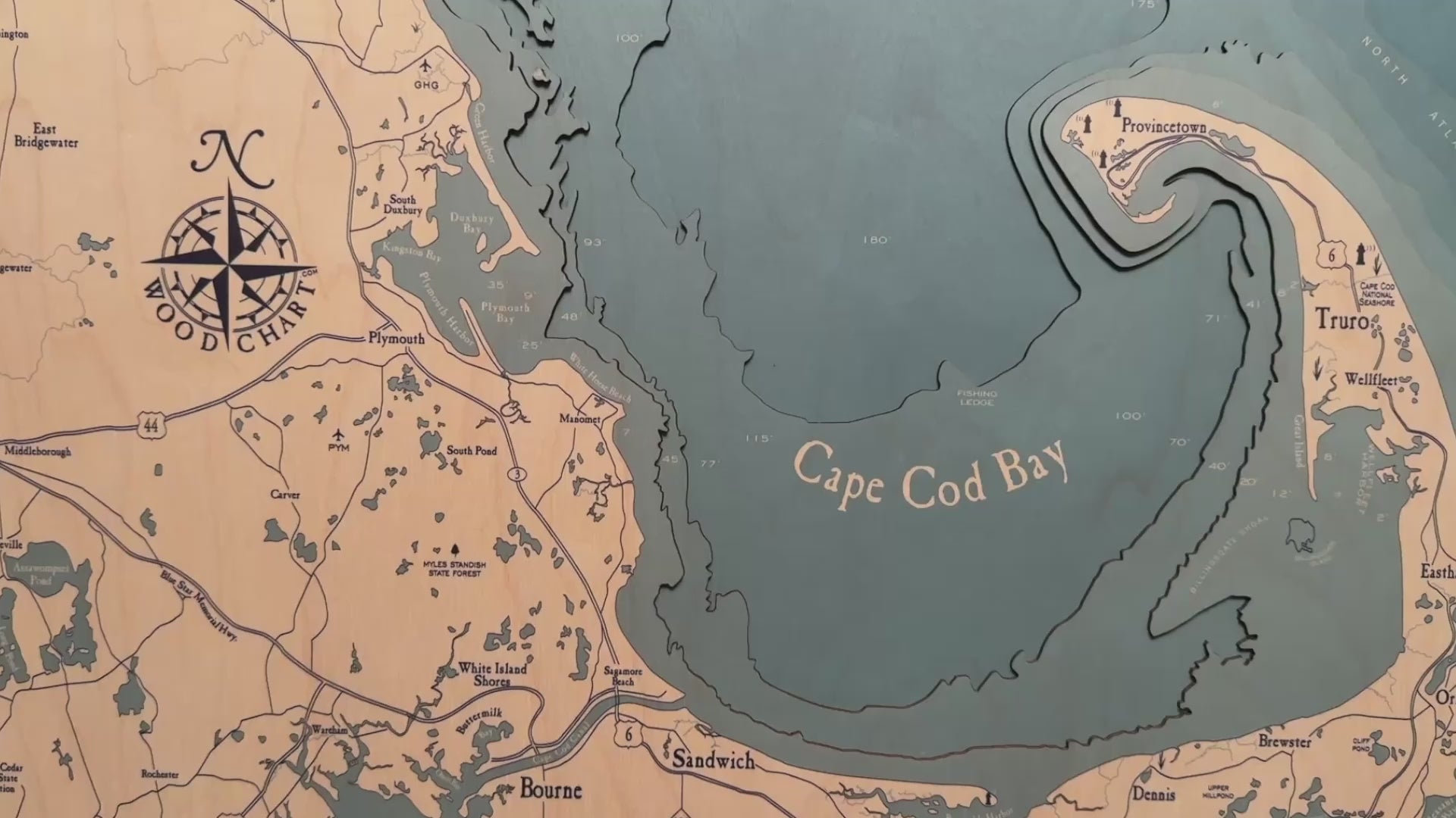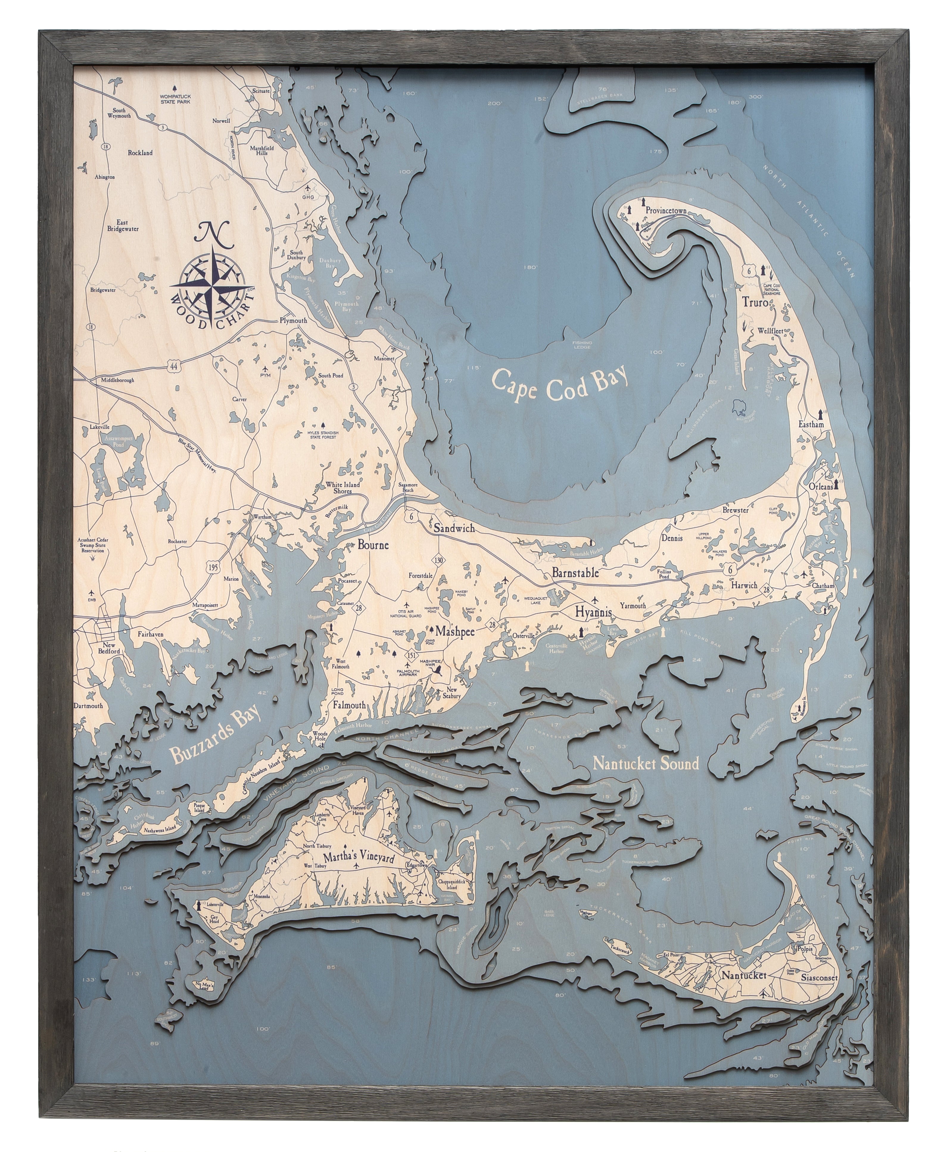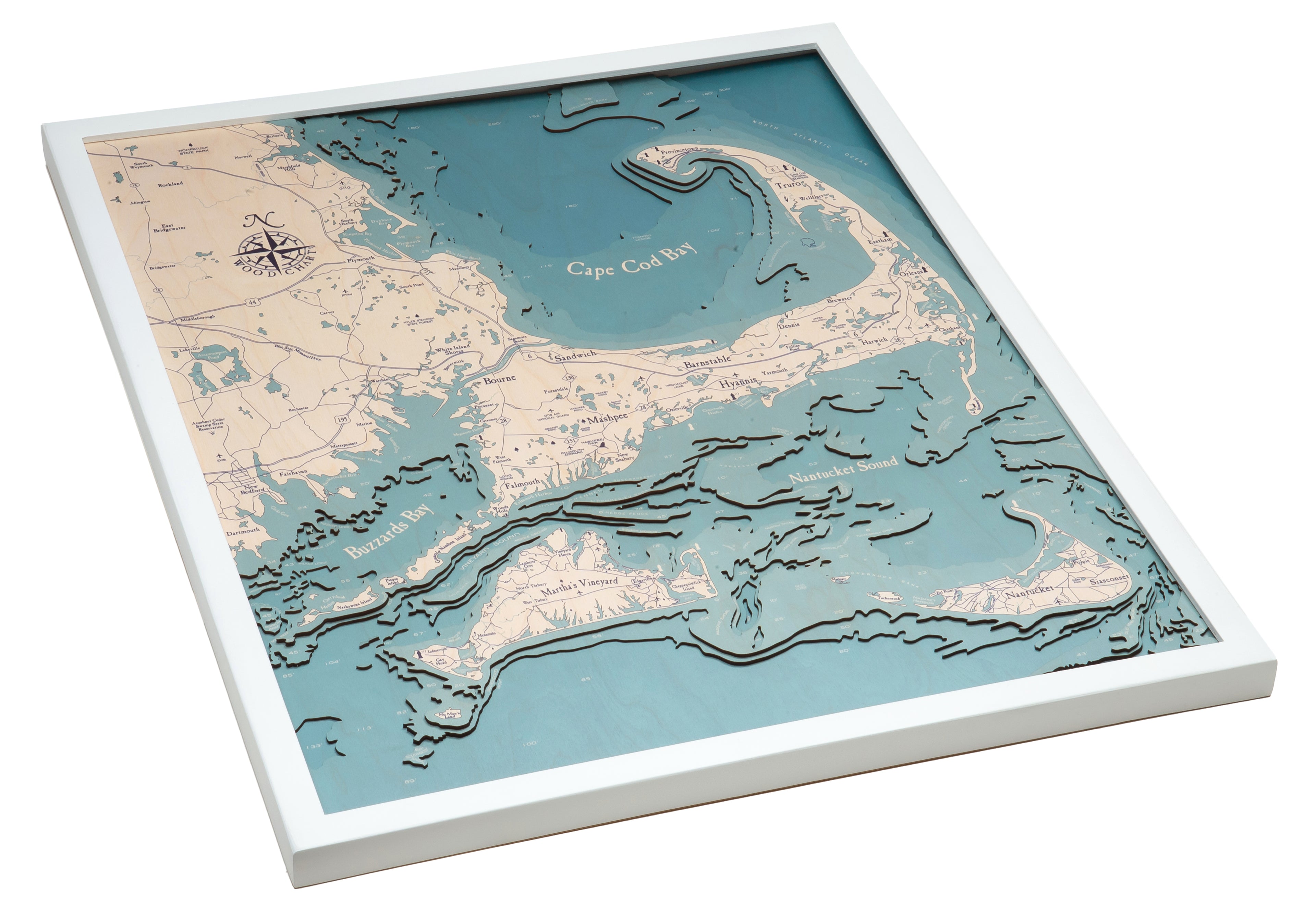 Our Cape Cod 3D wood map is one of a kind and is made with incredible attention to detail. High quality Baltic Birch is laser-cut into layers that depict the beautiful ocean depths. An artist binds the layers together to create the gorgeous depth our customers know and love and then hand-stains the surrounding water to match the chosen frame. Each layer is hand-stained so the water grows darker as the depth increases, creating a striking gradient that brings the contours of the lakes to life. Finally, we utilize ultra-high resolution UV printing to indicate points of interest and locations onto the map’s surface before a custom wood frame finishes the complete lake map and creates a perfect piece of wall art.