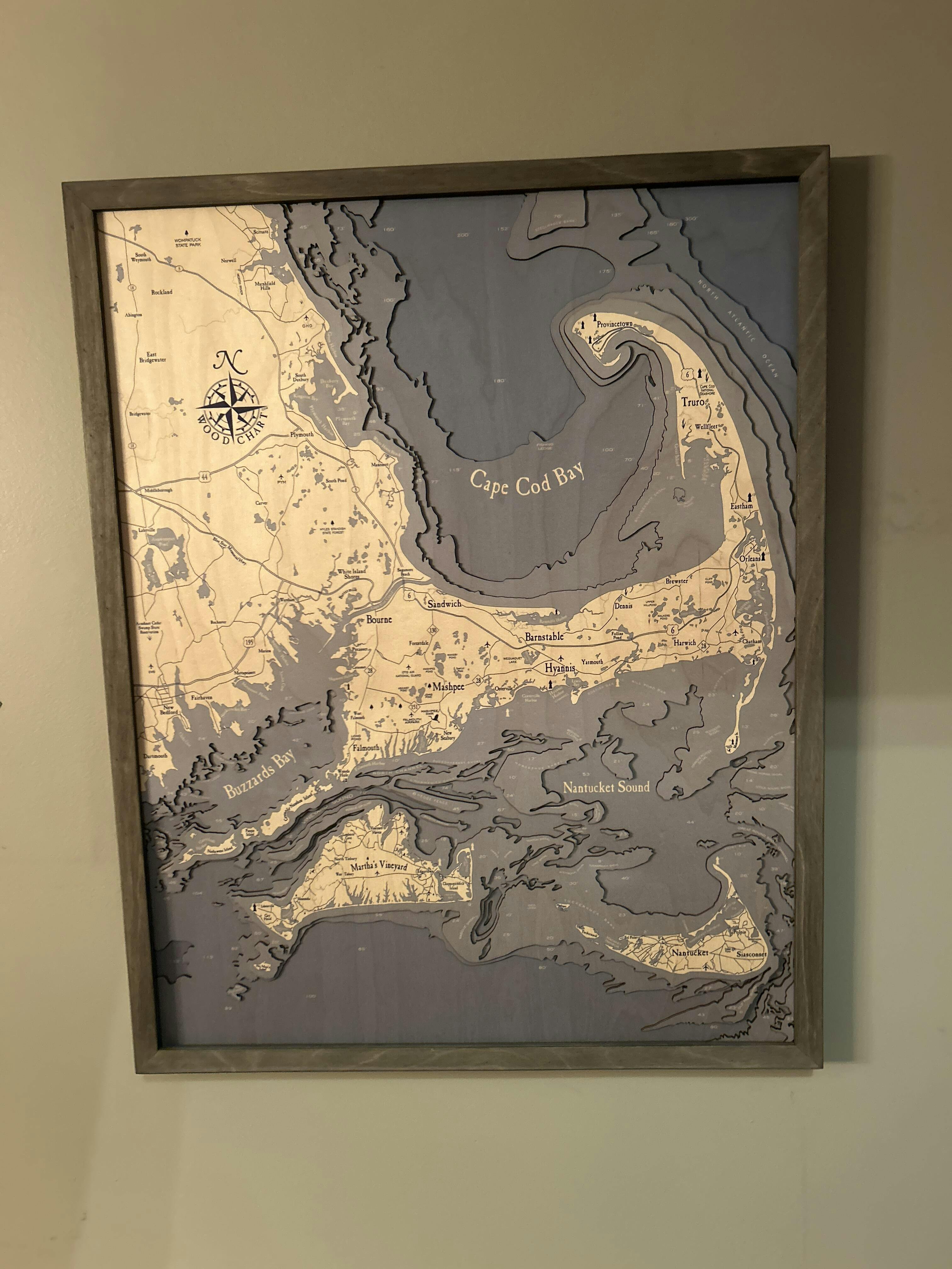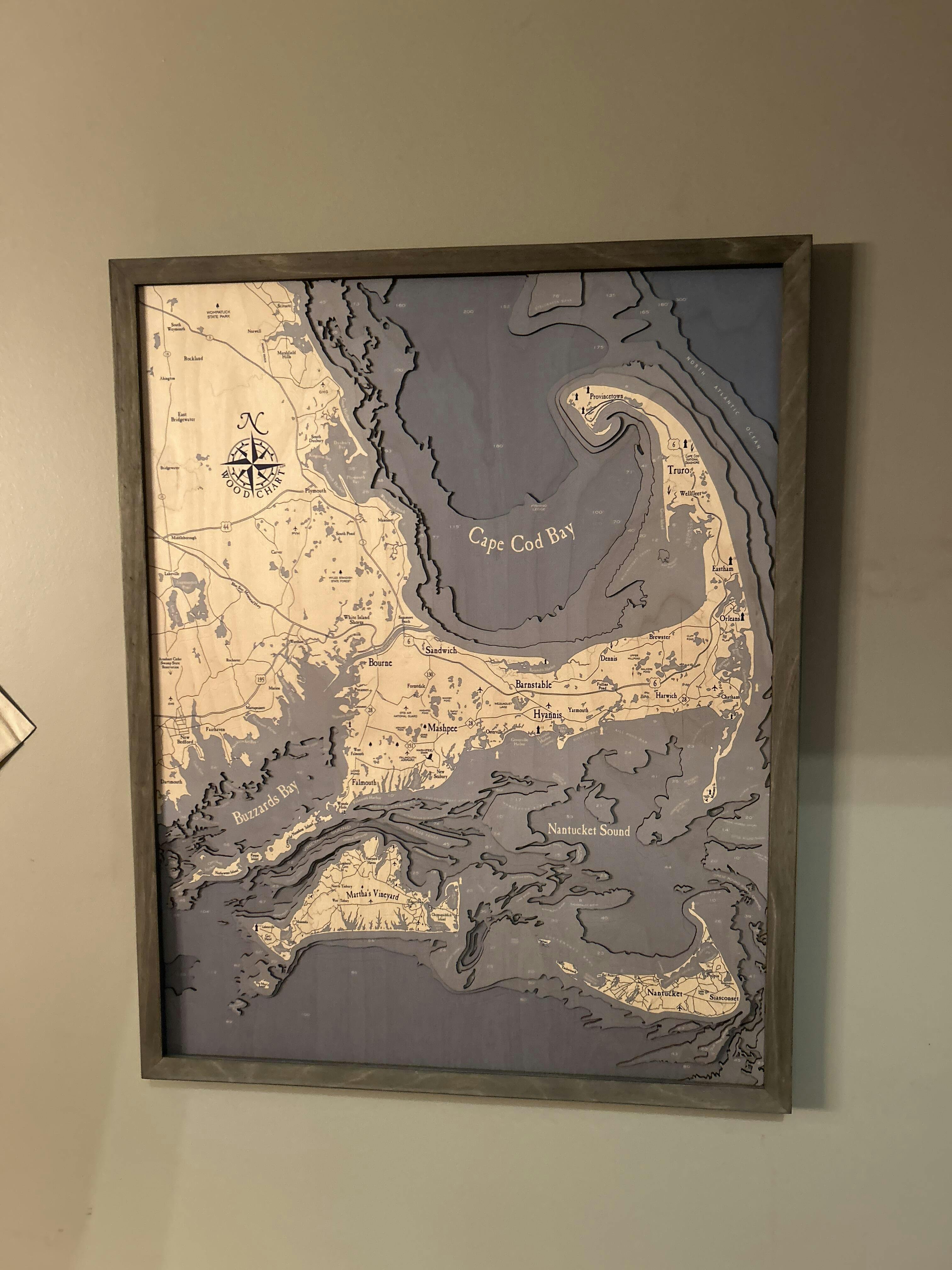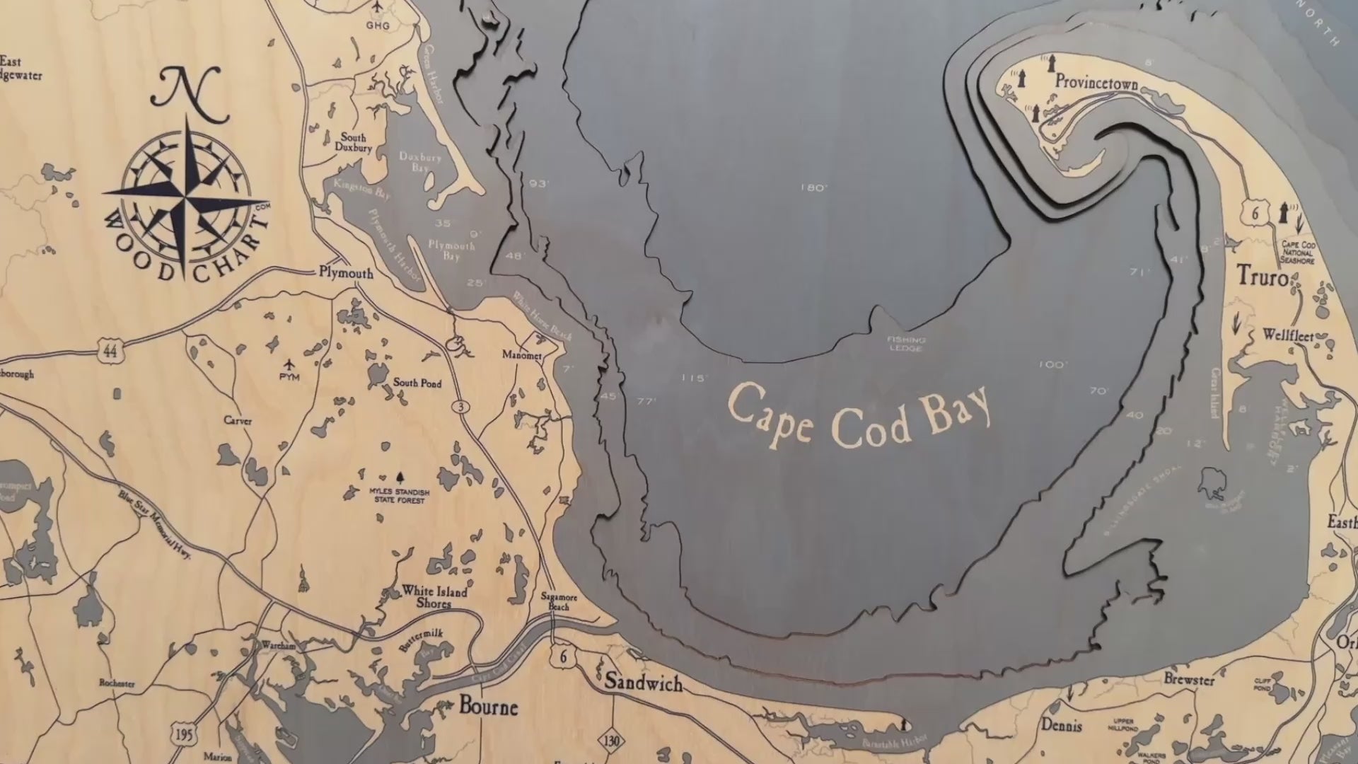 Our Cape Cod 3D wood map is one of a kind and is made with incredible attention to detail. High quality Baltic Birch is laser-cut into layers that depict the beautiful ocean depths. An artist binds the layers together to create the gorgeous depth our customers know and love and then hand-stains the surrounding water to match the chosen frame. Each layer is hand-stained so the water grows darker as the depth increases, creating a striking gradient that brings the contours of the lakes to life. Finally, we utilize ultra-high resolution UV printing to indicate points of interest and locations onto the map’s surface before a custom wood frame finishes the complete lake map and creates a perfect piece of wall art.