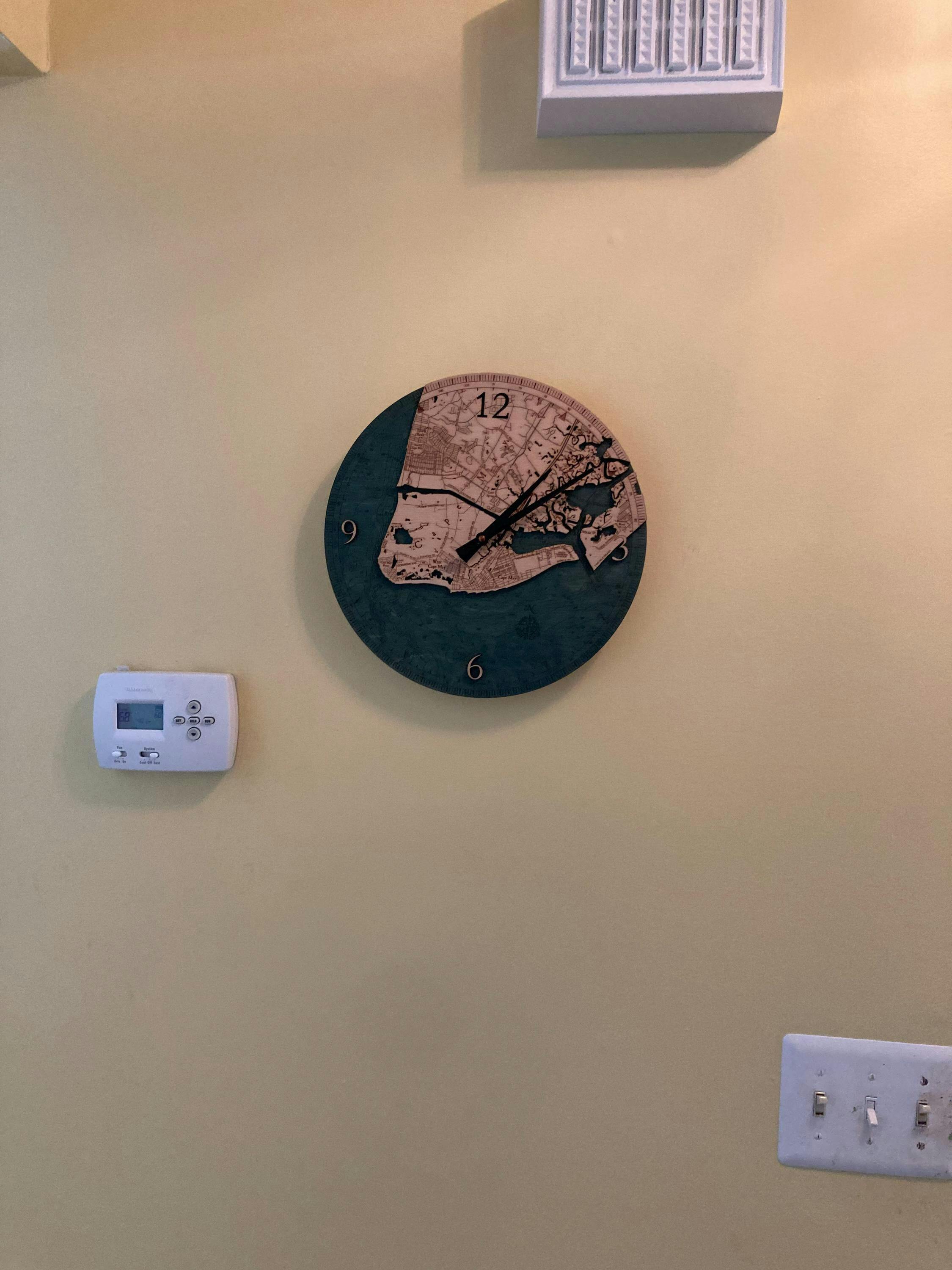 Our nautical wood map clock depicts the landscape of Cape May as well as the surrounding shorelines. The Cape May Clock is twelve inches in diameter and features an outline of the island with a recessed layer below the land to provide beautiful dimension. Water depth contours are laser etched into the clock’s face to show the topographical lines of the ocean floor and are highlighted by a deep blue-green stain. The lake art clock's face has been etched with a wood map featuring the precise shorelines, landmarks, highways, and lettering to create a one-of-a-kind keepsake of the island’s beauty.