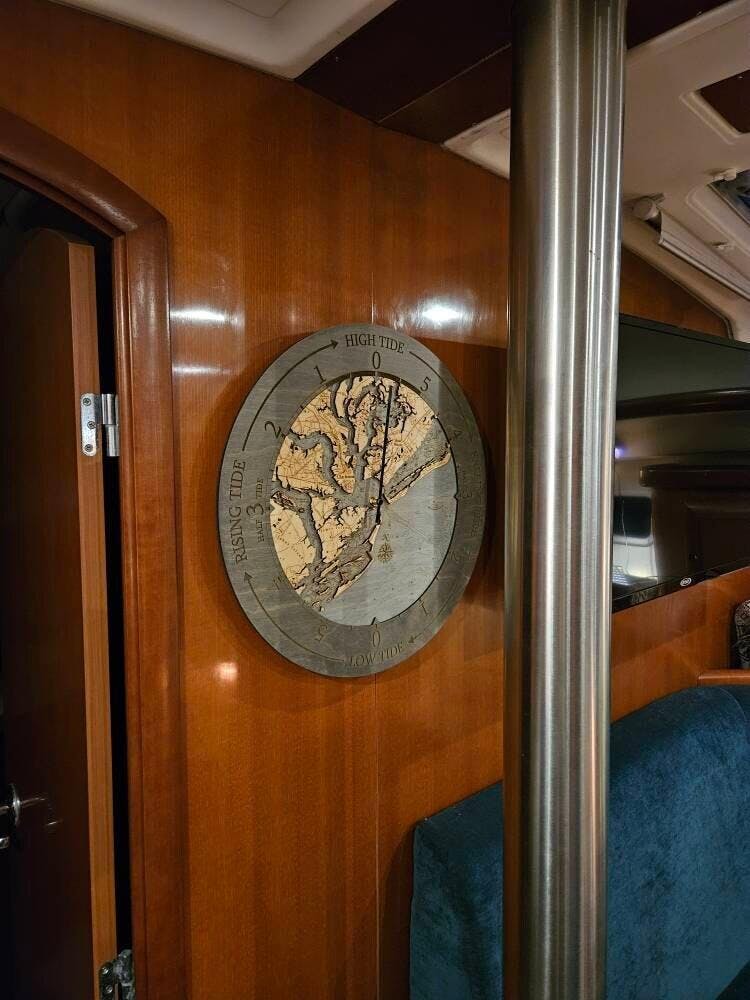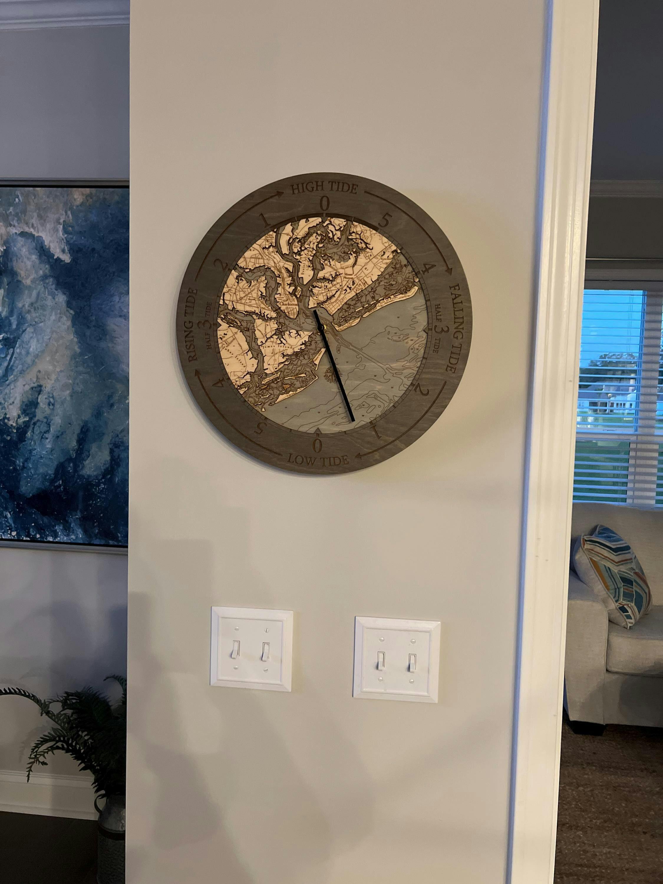 Our nautical tide clock showcases the landscape of Charleston and its surrounding areas. The Charleston Clock is sixteen and a half inches in diameter, including an outline of the island in birch with a recessed layer below the land. The depths of the surrounding water are laser etched into the clock’s face and showcase the topographical lines of the ocean floor. Our artist hand-stained the face of the clock a beautiful greyish-blue color, and landmarks and points of interest are engraved into the wood map to create a picturesque keepsake of the beauty of Charleston.