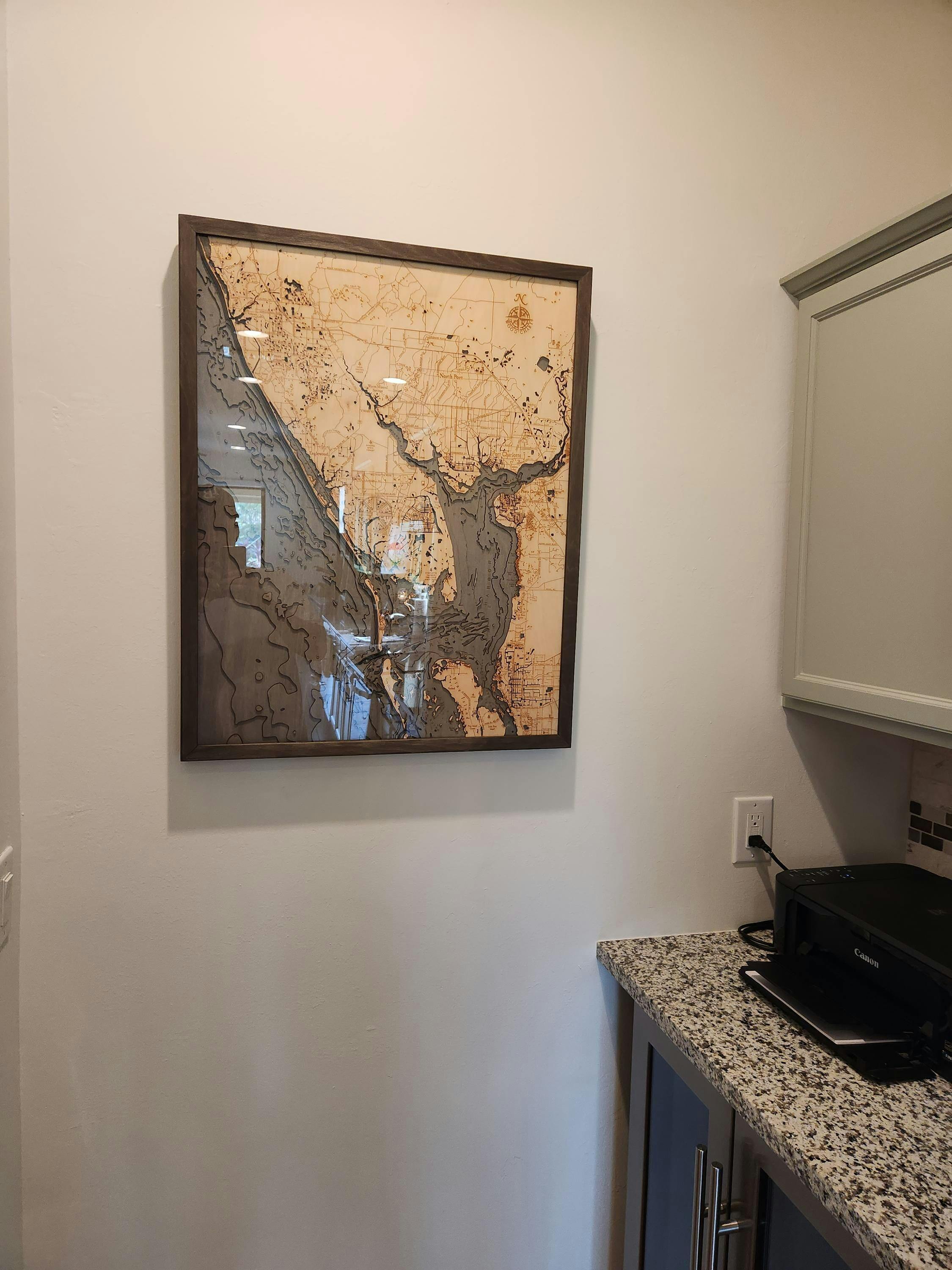 Our 3D nautical wood map of Charlotte Harbor begins with layers of Birch that are laser cut and glued together to form the intricate shoreline the area is known for and add a vibrant dimension to the framed piece. The water is hand-stained, and points of interest, roads, and ocean depths are etched into the map’s surface. The 3D nautical wood map is finished with a custom wood frame and a durable acrylic cover for protection.