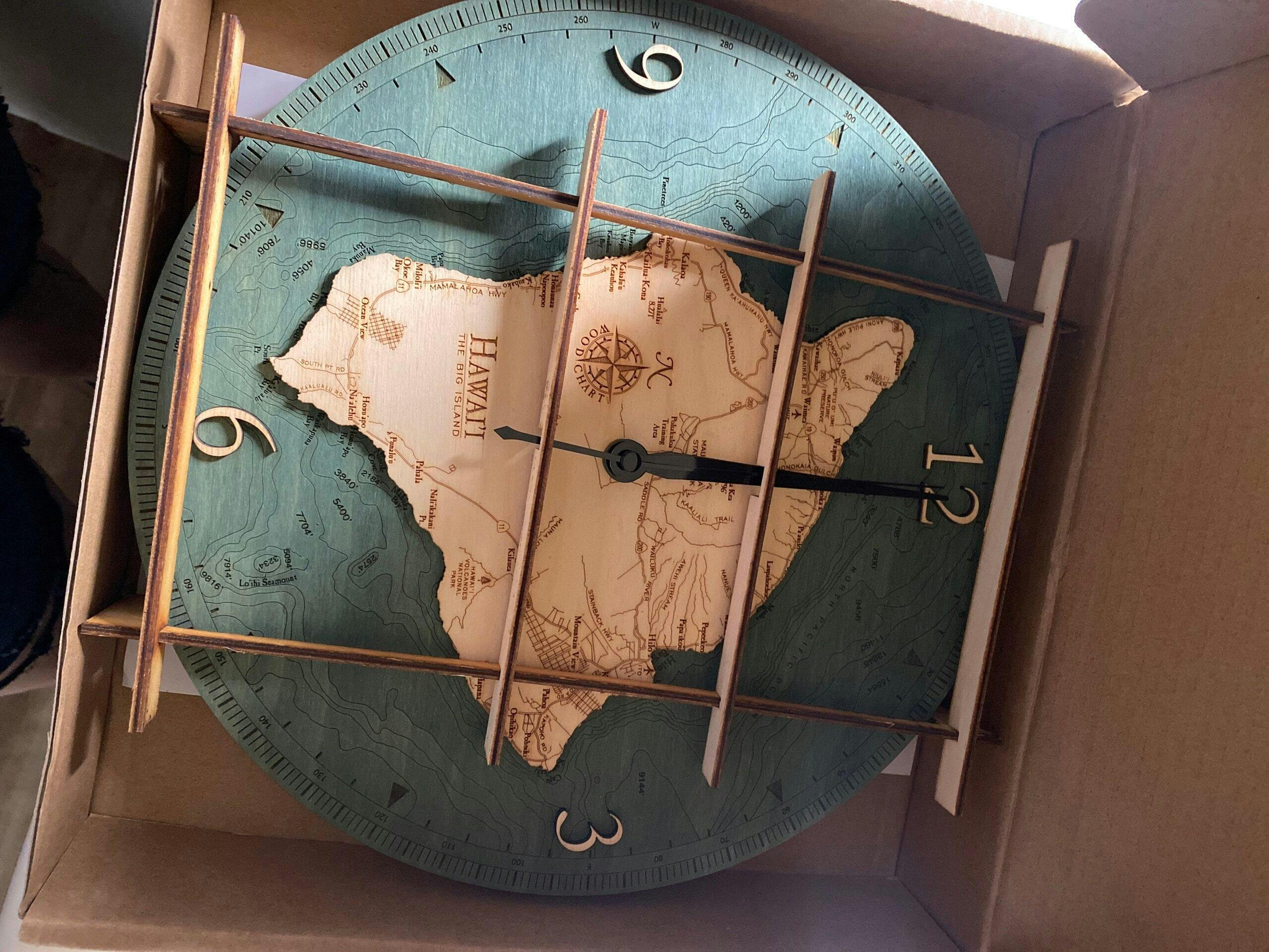Our 3D wood map design process starts with creating a bathymetric chart of the island to ensure the precise topography of the water. A layer of laser-cut birch creates depth while the ocean terrain is etched into the map’s surface with incredible accuracy. The water is hand-stained, and then a designer etches the points of interest into the clock’s face.