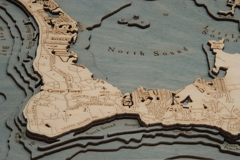Allow your mind to take a mental vacation to the white sand beaches of Grand Cayman with this stunning nautical 3D wood map.
