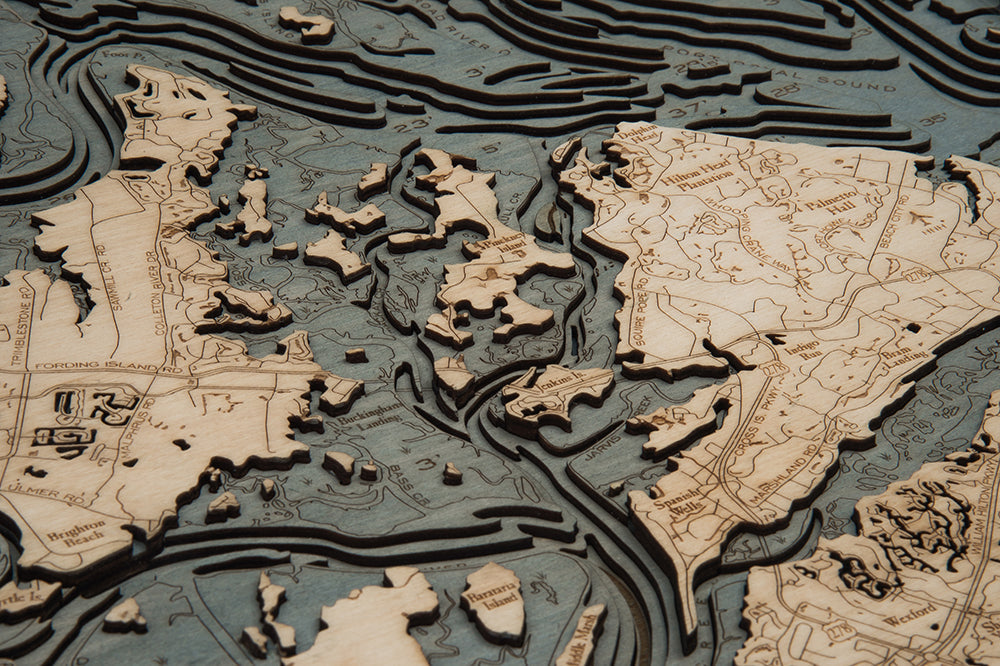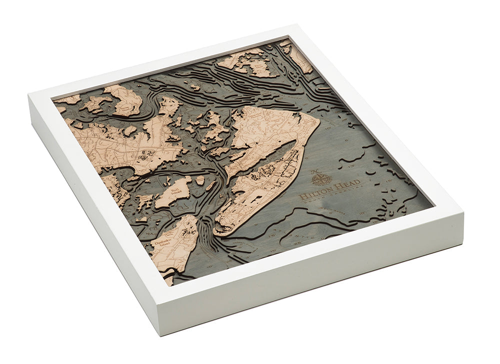 Somehow, the natural beauty of the landscape of Hilton Head is even more incredible when displayed on a 3D wood map. Our nautical wood chart of Hilton Head uses beautiful high-quality birch to showcase the intricate water depths, shorelines, and water passageways the area is known for. An artist laser cuts layers of birch, gluing them together to form an exact representation of the island landscape. The water is hand-stained before being engraved with points of interest, river names, and water depths. The natural look of the high-quality birch shows through on the map’s top layer, providing a contrast that is accentuated by a custom wood frame that fits precisely the shape and size of the wood chart.