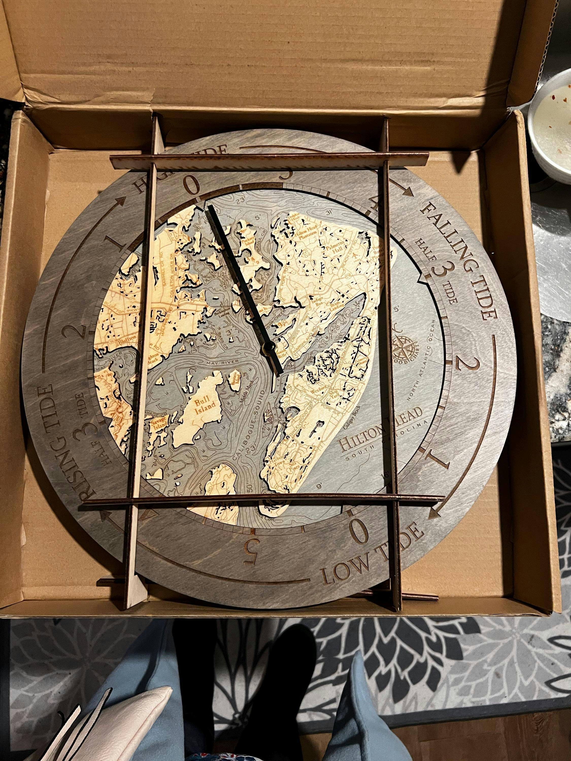 Our Hilton Head Tide Clock brings to life the beautiful coastline of the region. Birchwood is hand-stained and creates a natural foundation for the wood chart. An artist expertly engraves precise water depth lines on the clock’s surface, while a raised layer of birch highlights the small and large islands that makeup Hilton Head. Points of interest, roads, and depth indicators are etched into the nautical wood map clock, creating a piece of art that is both beautiful and functional.
