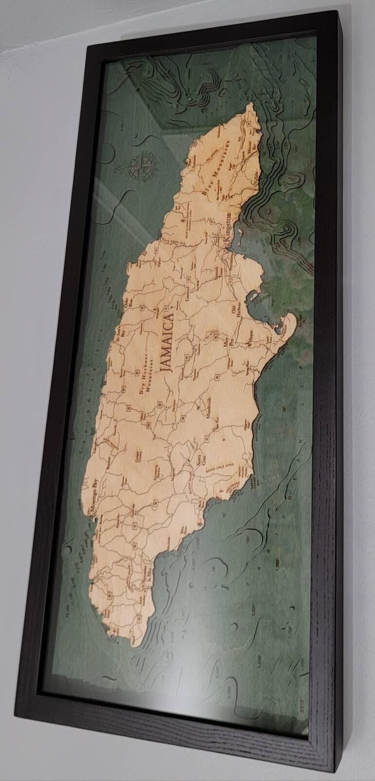 Our 3D wood map of Jamaica brings your love of this incredible island to life no matter where you are. Designers transfer the outlines from bathymetric maps onto pieces of high-quality birch that are then glued together and stained to create the vibrant and dimensional look that will wow you. Significant points of interest are etched into the 3D map’s surface, and a custom wood frame puts the finishing touches on this beautiful piece of wood wall décor.