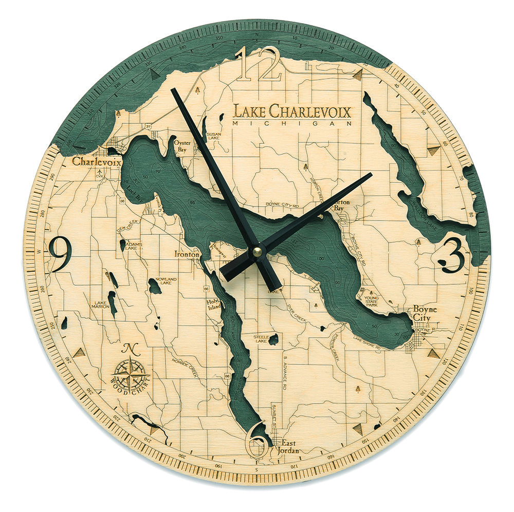 Our topographic map clock of Lake Charlevoix is made of laser cuts of high-quality birch to create a replica of the shoreline, which is then positioned slightly above the clock's face. The hand-stained water and slight elevation of the birch give this wood clock a beautiful dimension. Finally, water depth contours and points of interest are expertly etched into the clock’s surface, creating a unique keepsake.