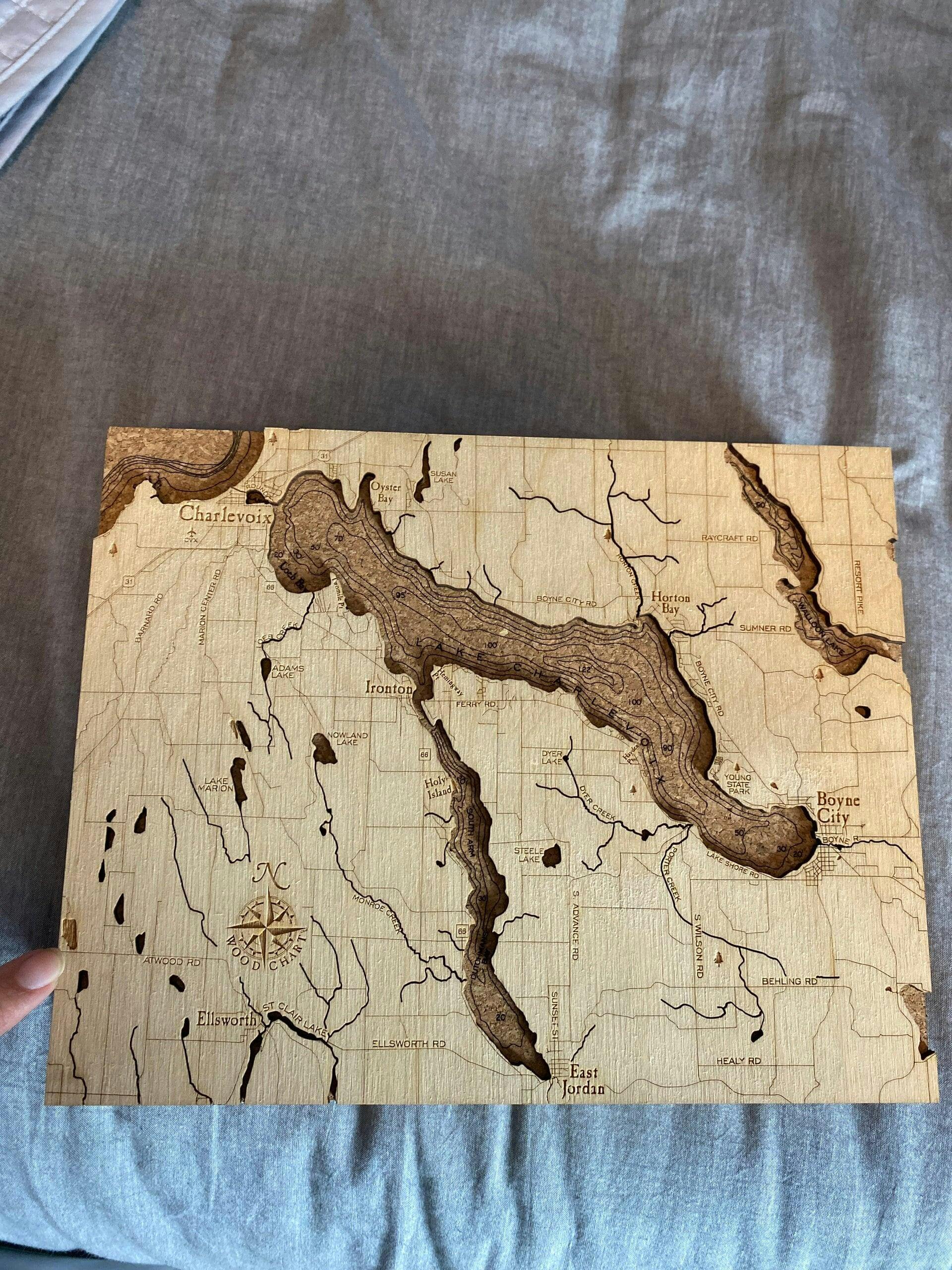 Our Lake Charlevoix Cork Map is a customer favorite for office décor. Each map begins with a bathymetric chart of the lake’s depths. A layer of high-quality birch is laser cut into the exact shoreline of the lake and then precisely glued onto a piece of cork etched with the lake’s depths. Finally, points of interest and other landmarks are carved into the topographic map’s surface, adding even more detail and intrigue to this beautiful lake art.