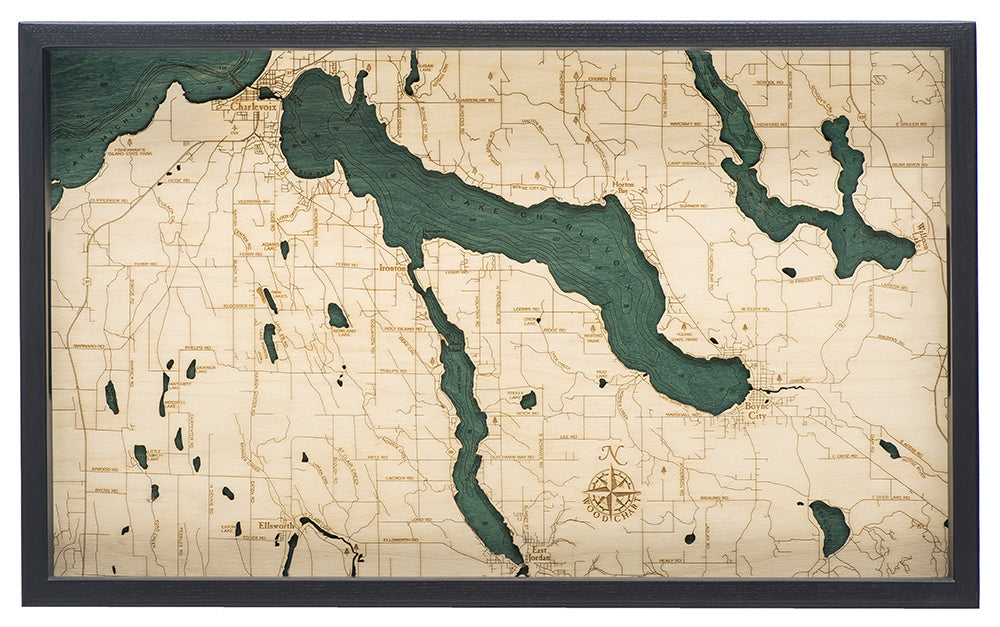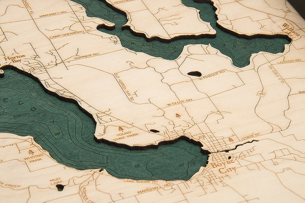 Our Lake Charlevoix Serving Tray lets you show off one of your favorite travel destinations any time of year. Each topographical map serving tray begins with a bathymetric chart of the lake. A piece of high-quality birch is laser cut into the precise shoreline shape of the lake and then placed on top of the hand-stained tray, adding to the unique dimension of the map. Water depths and points of interest are etched into the tray’s surface before a durable piece of acrylic complete the lake art.