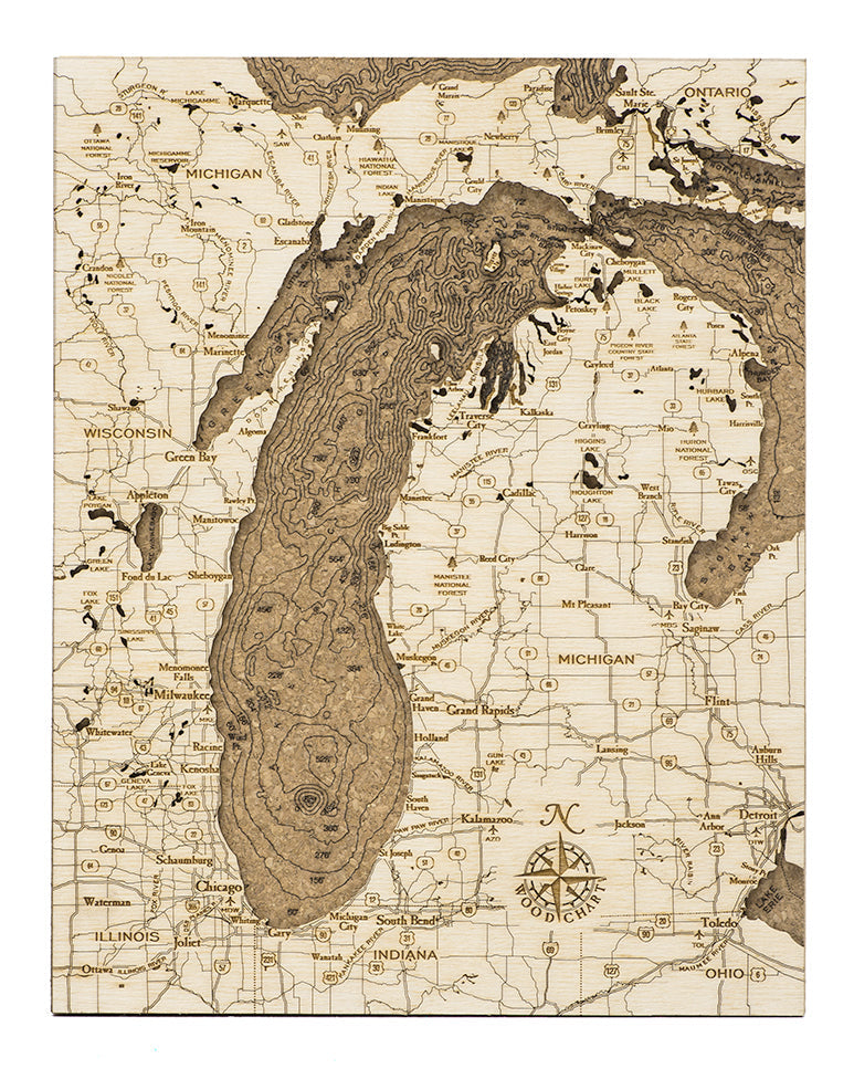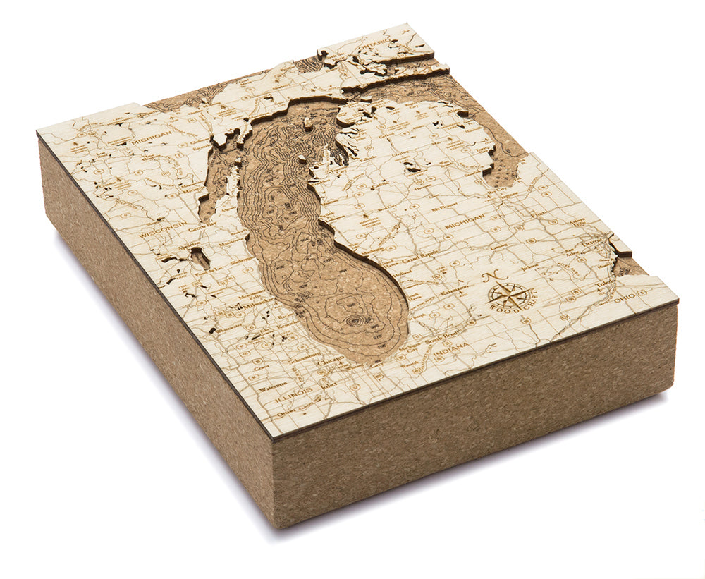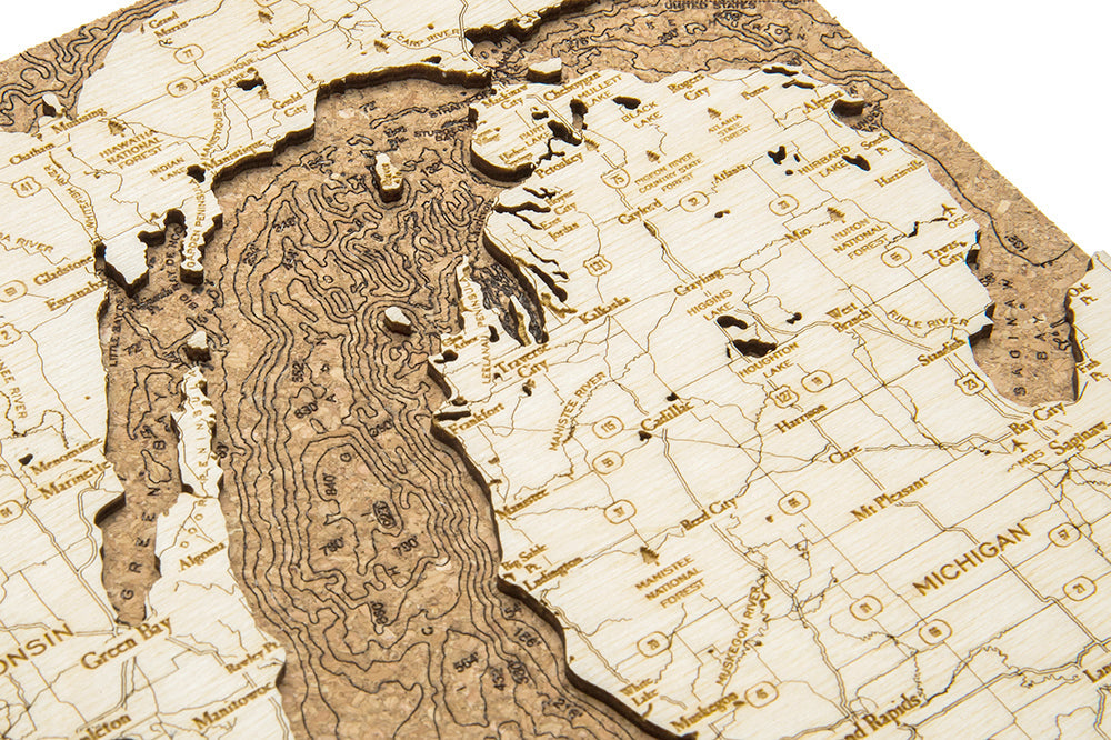 Our wood lake art of Lake Michigan begins with understanding the topographical landscape of the area. An artist uses a bathymetric chart to etch the depth measurements into the cork before adding a laser-cut piece of high-quality birch on top. The birch creates beautiful depth and includes etched landmarks and points of interest that make our maps one-of-a-kind.
