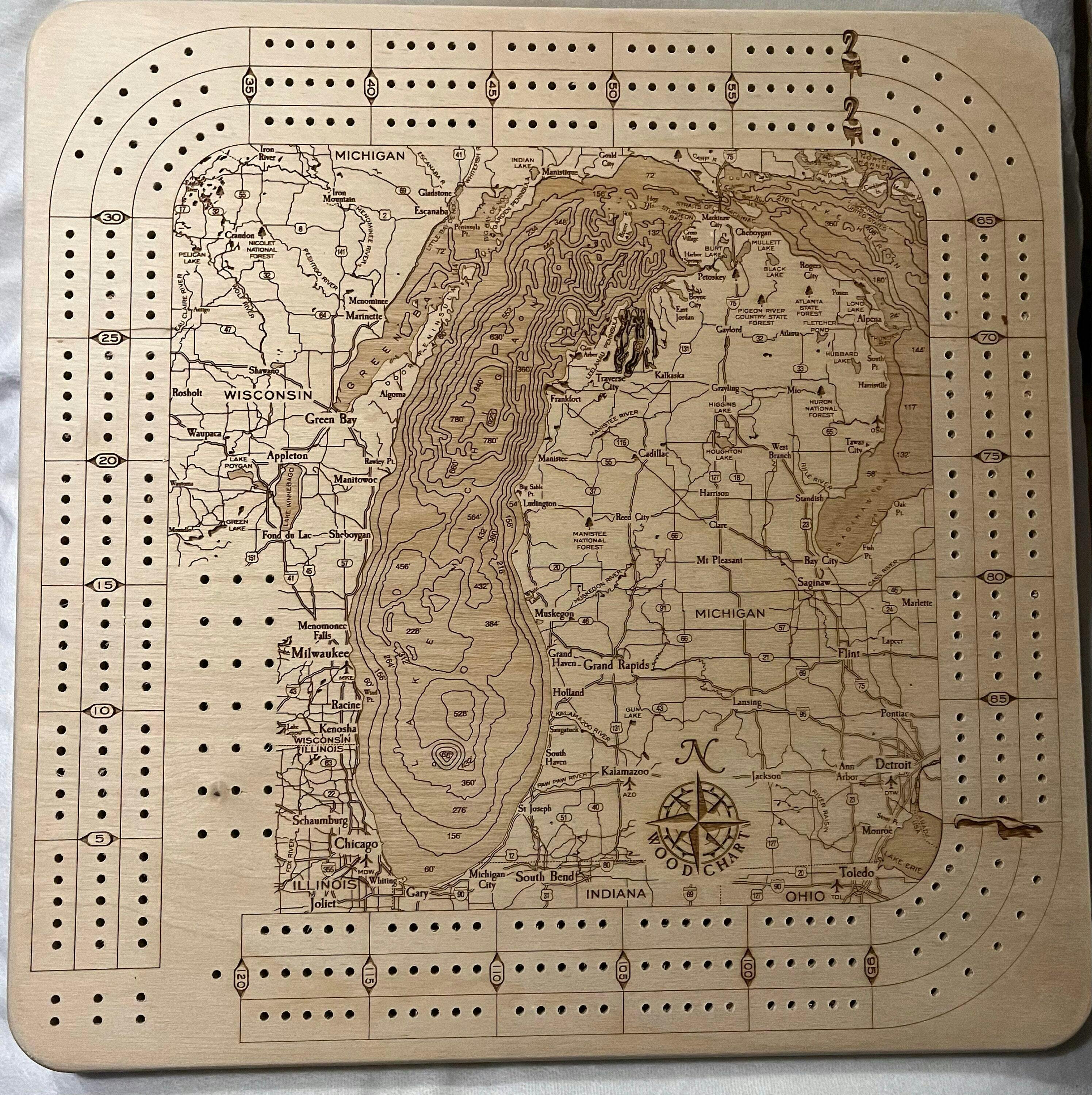Our Lake Michigan Cribbage Board allows scorekeeping for three players and uniquely showcases the topographical beauty of the region. Each board features a wood lake etching of the lake’s shoreline and depth measurements, including points of interest and landmarks the area is known for. Our lake art cribbage boards include skunks, pegs, and a hidden compartment and are sealed with an oil-based finish that highlights the natural grain of the high-quality Birch. Place this board on your coffee table or hang it on the wall using the notch on the back.