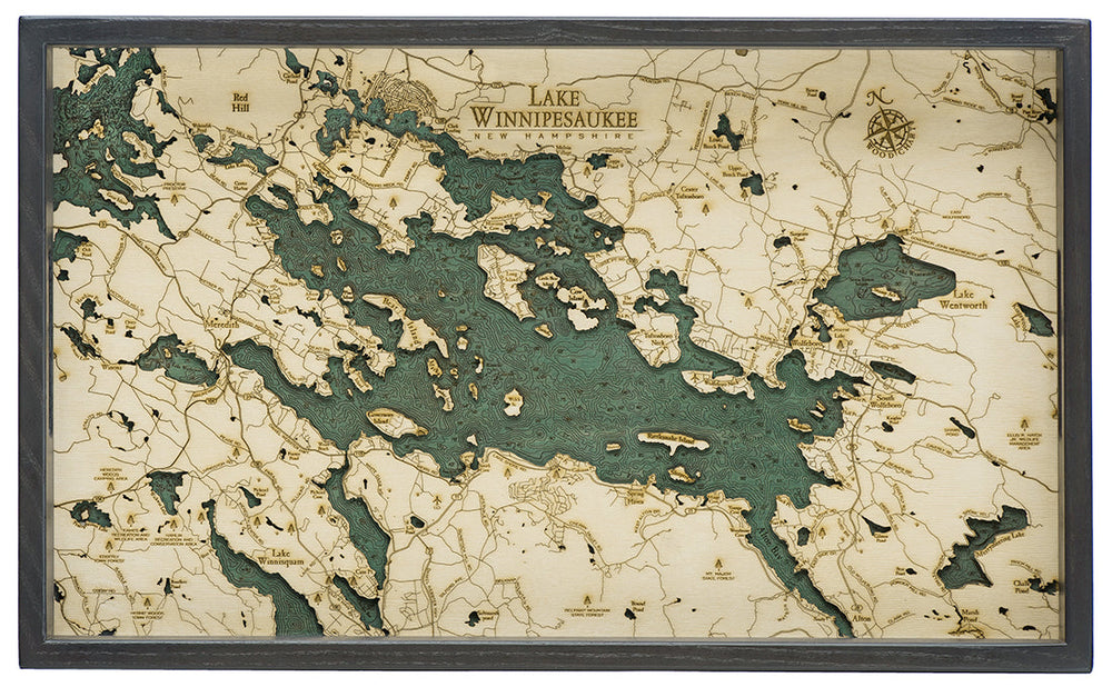 Our Lake Winnipesaukee Serving Tray features solid high-quality birch with hand-stained accents and laser engraving. An artist uses a bathymetric chart to engrave the precise depths of the lake into the wood, then layers it together by hand using specialized glue. Points of interest, islands, and major roads are etched into the topographical wood map’s surface, and an acrylic layer completes the wood lake.