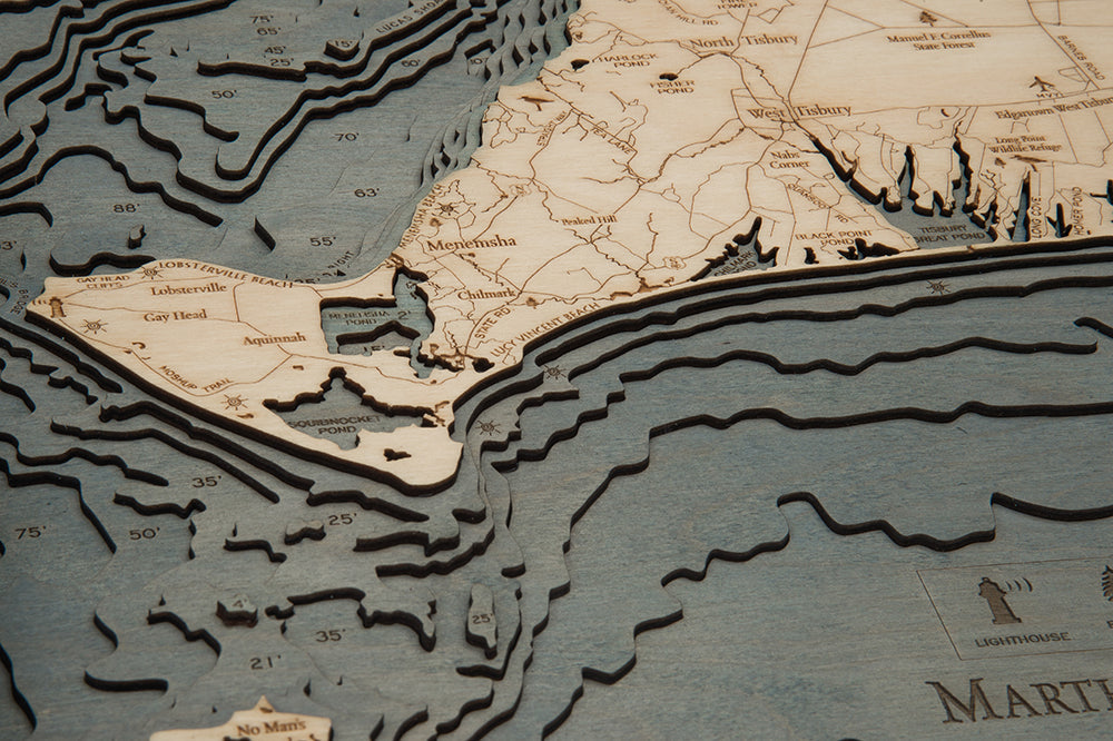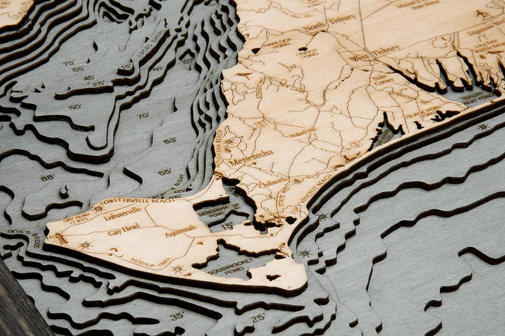 Our 3D wood map of Martha’s Vineyard begins as a bathymetric chart. The chart helps the artist accurately portray the topography of the island and its surrounding water. Pieces of high-quality birch are laser cut into the exact shapes of the island and water depths. They are then glued together to form the beautiful dimension our wood charts are known for. The water is hand-stained and points of interest are etched into the surface. A custom-sized solid wood frame completes the nautical wood map.
