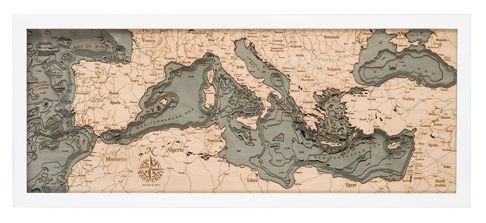 Our 3D wood map of the Mediterranean Sea begins with a bathymetric chart that documents the underlying landscape of the seafloor. An artist uses the measurements and depths from the chart to laser cut pieces of high-quality birch into distinct layers to showcase the topography of the sea and surrounding land. The layers depicting the water are hand-stained, and points of interest, water depths, and country names are etched into the surface of this nautical map. Each 3D wood map is finished with a solid wood frame and acrylic glass protective layer.