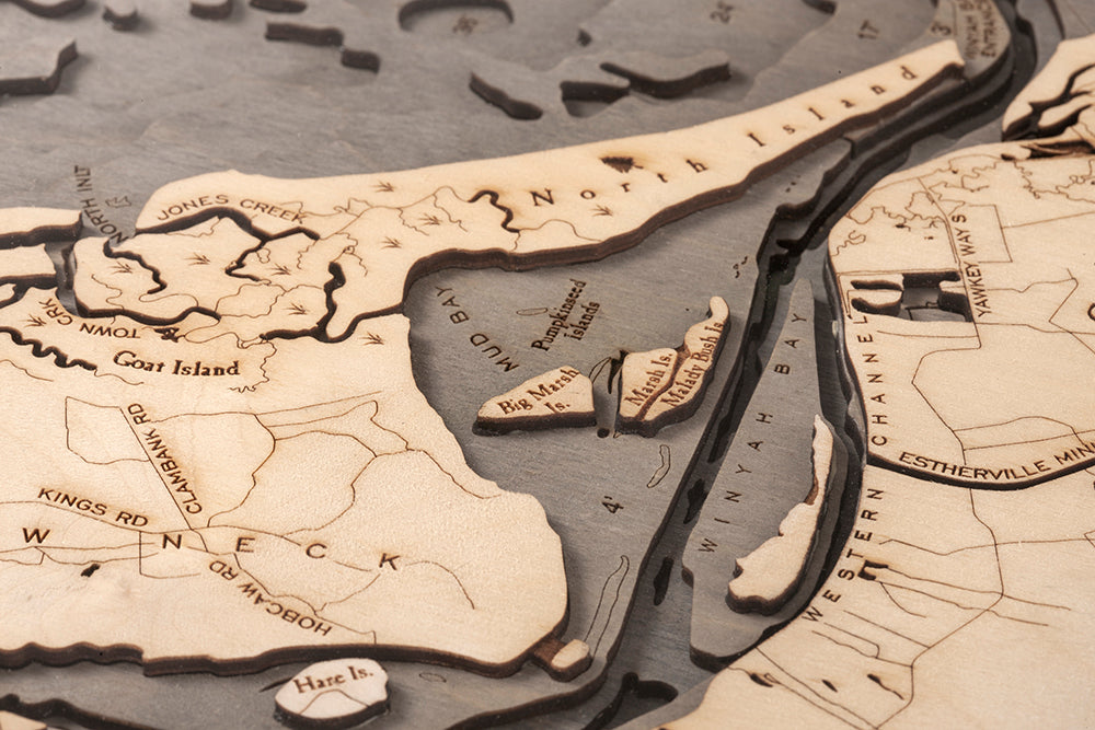 Our 3D wood map of Myrtle Beach offers a perfect way to commemorate one of your favorite vacation spots in style. The nautical map includes hand-stained high-quality birch, laser-cut layers depicting the ocean's precise water depths, etched points of interest, and other important destinations in the map’s surface that make it unlike anything else you’ll find on the market. Each map is finished with a solid wood frame and acrylic layer for protection.