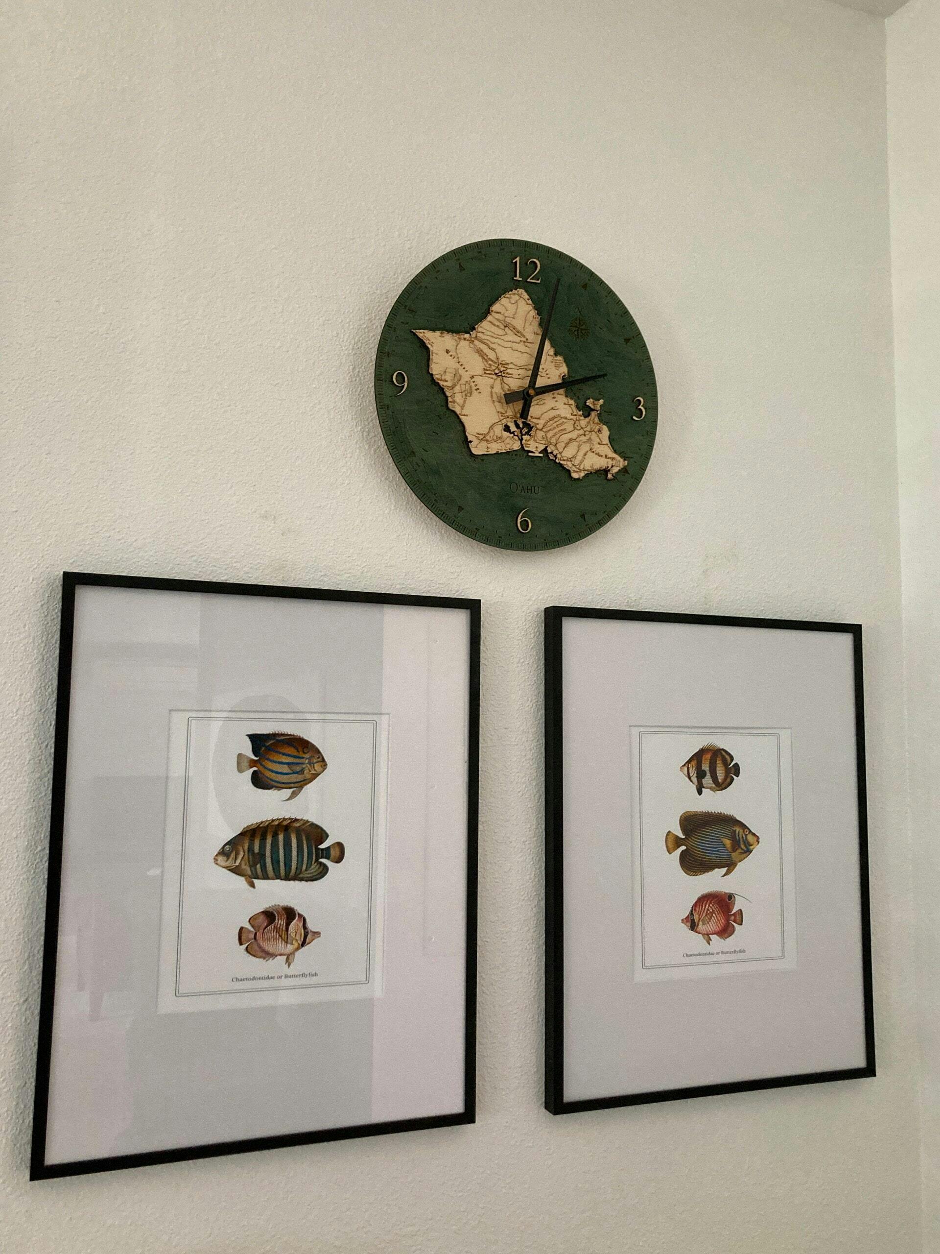 The archipelago of Oahu was formed by volcanic fire and ocean water. This nautical wood map of the islands highlights the depths of the channels and shallows of the shorelines. The historic site of Pearl Harbor is beautifully detailed on this wood chart.