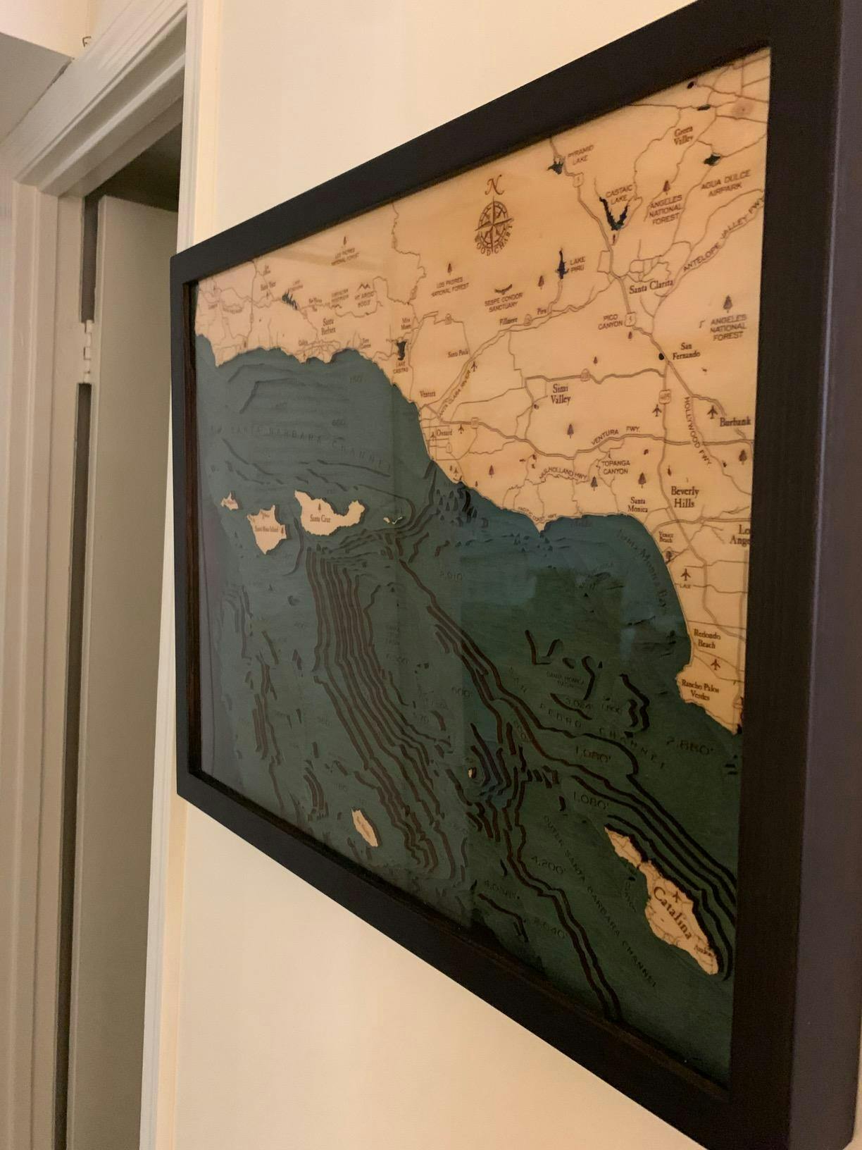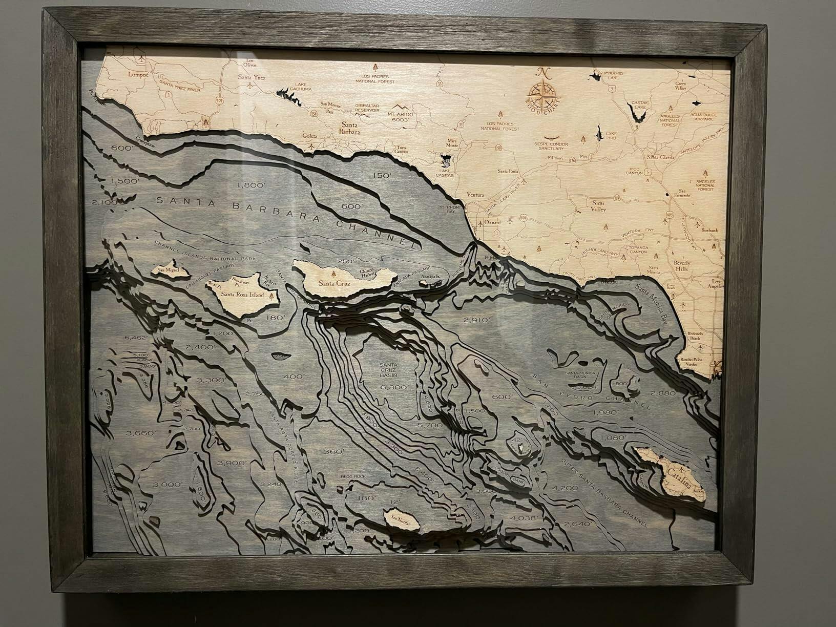 Explore the details on a 3D wood map to fully appreciate the bathymetry of these historic basins and channels. Each point of interest is clearly etched into the wood chart, providing a remarkable perspective of the laser-cut depths and shallows of the waters surrounding the Santa Barbara Channel Islands. The nautical wood map is finished in a solid wood frame, protected by acrylic glass, and arrives ready to hang.