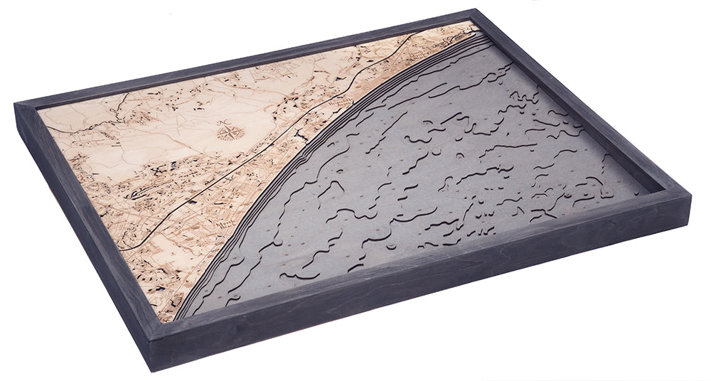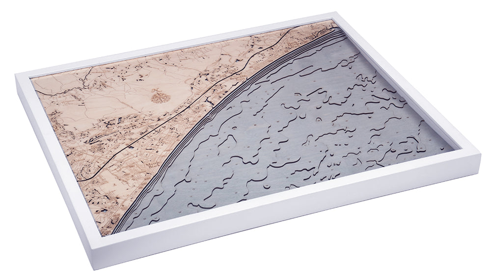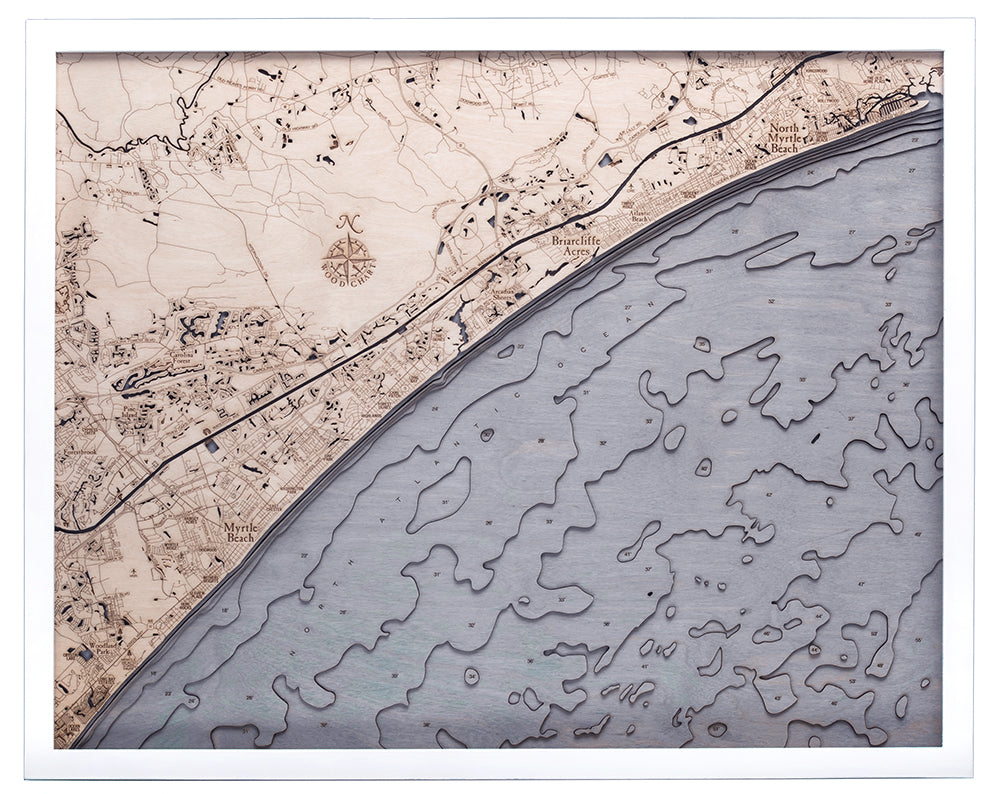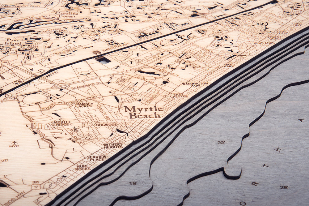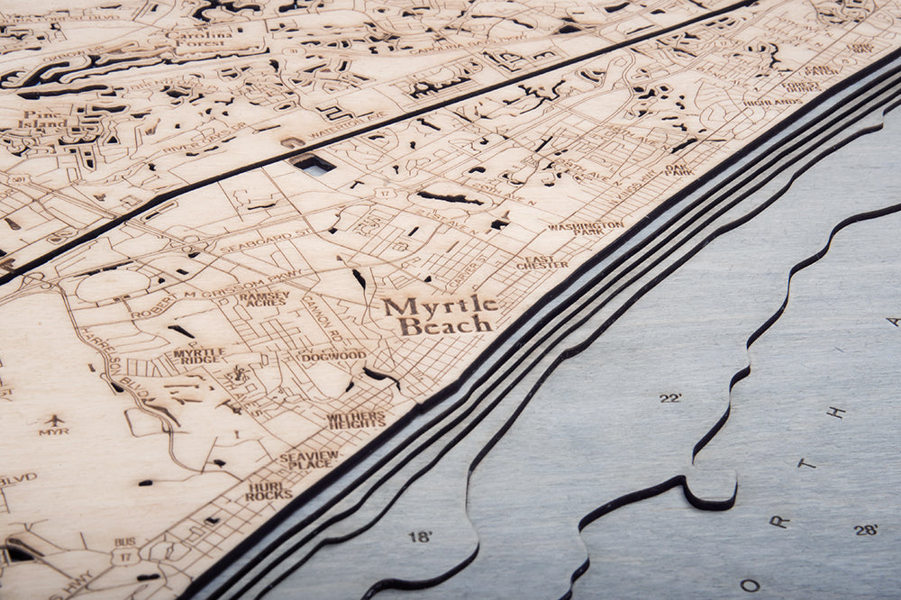 Our 3D wood map of Myrtle to North Myrtle Beach offers a perfect way to commemorate one of your favorite vacation spots in style. The nautical map includes hand-stained high-quality birch, laser-cut layers depicting the ocean's precise water depths, etched points of interest, and other important destinations in the map’s surface that make it unlike anything else you’ll find on the market. Each map is finished with a solid wood frame and acrylic layer for protection.